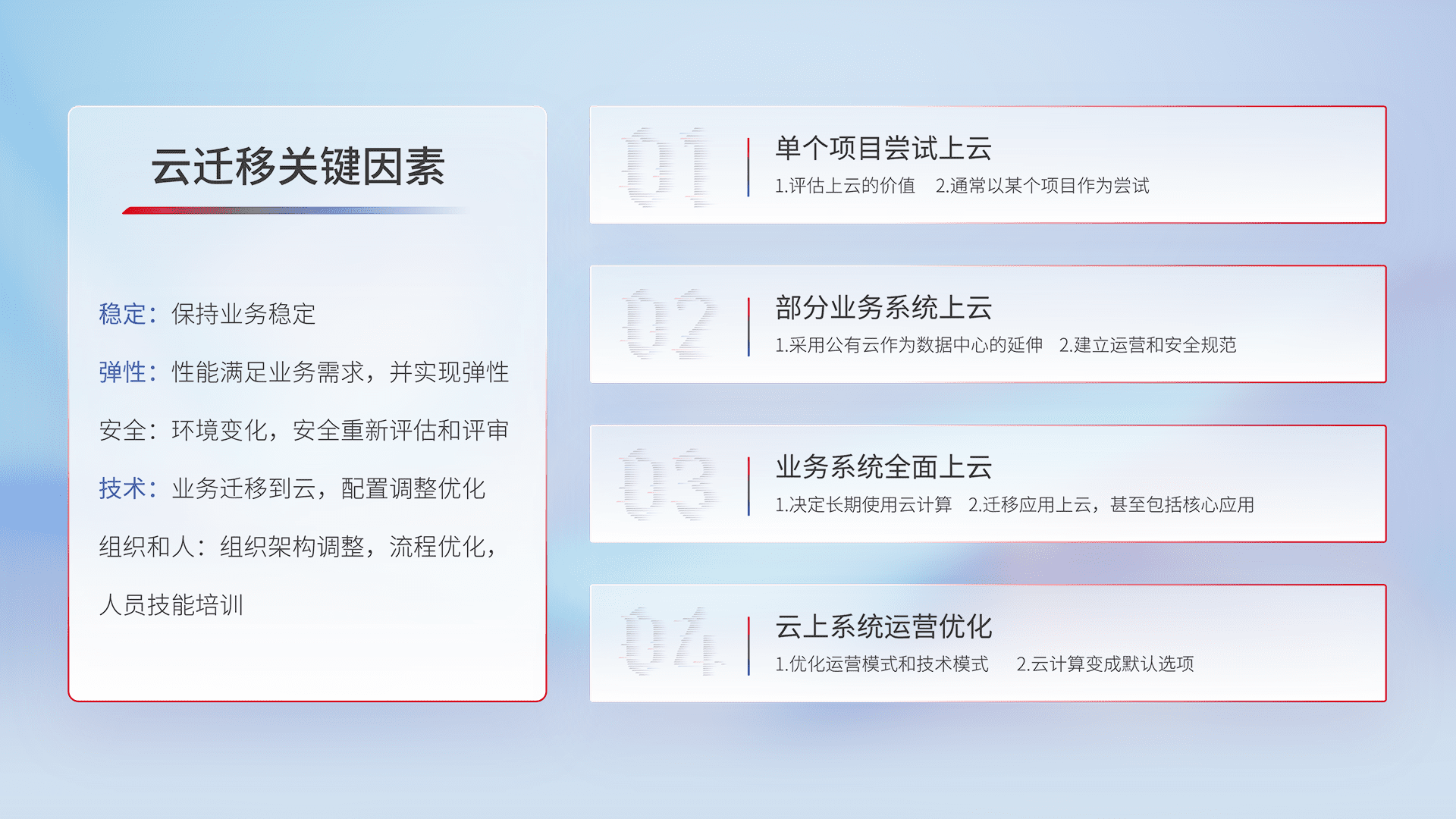 结合实际业务,,,从规划设计、、云平台选型、、云原生改造、、、、数据迁移、、、、集成交付,,,,迁移全过程为客户识别最佳上云路径,,做好风险识别管理,,,设计网络架构、、身份权限、、、、安全审计合规、、操作审计、、、日志审计、、、、监控告警策略、、、、多站点容灾设计等,,,对云上基础设施进行整体规划,,,提升IT治理水平,,以满足弹性、、、、高可用、、、高性能的需求。。