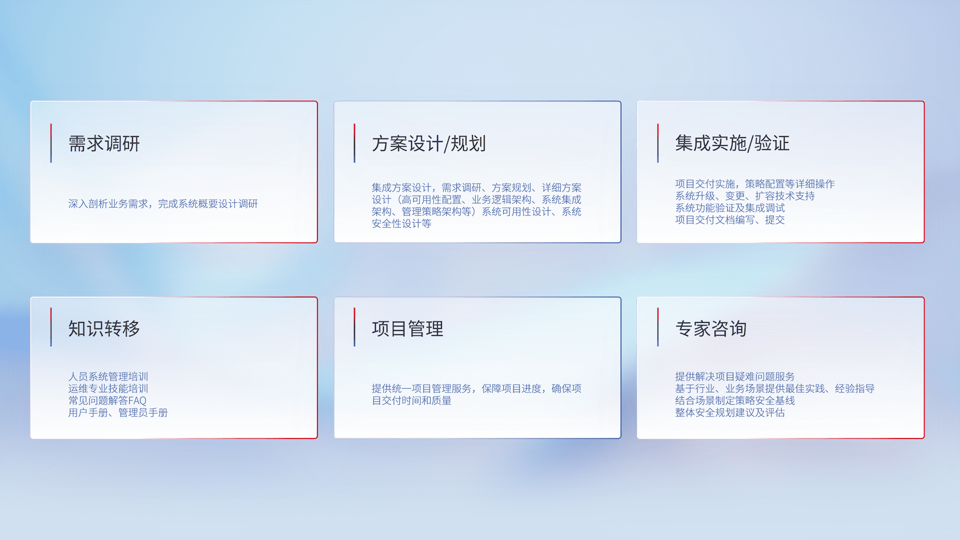 针对客户行业特性,,,,将宏观的安全战略和需求,,通过专业的交付服务,,,,实现项目落地,,为客户提供标准规范的集成交付服务。。